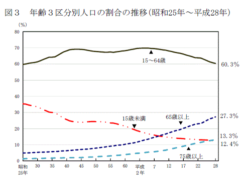 65歲以上的人口比重已經(jīng)上升至紀(jì)錄新高的27.3%,而15歲以下人口占比則跌至紀(jì)錄新低。15-64歲的勞動力人口繼續(xù)下滑至60.3%,為1951年以來最低。